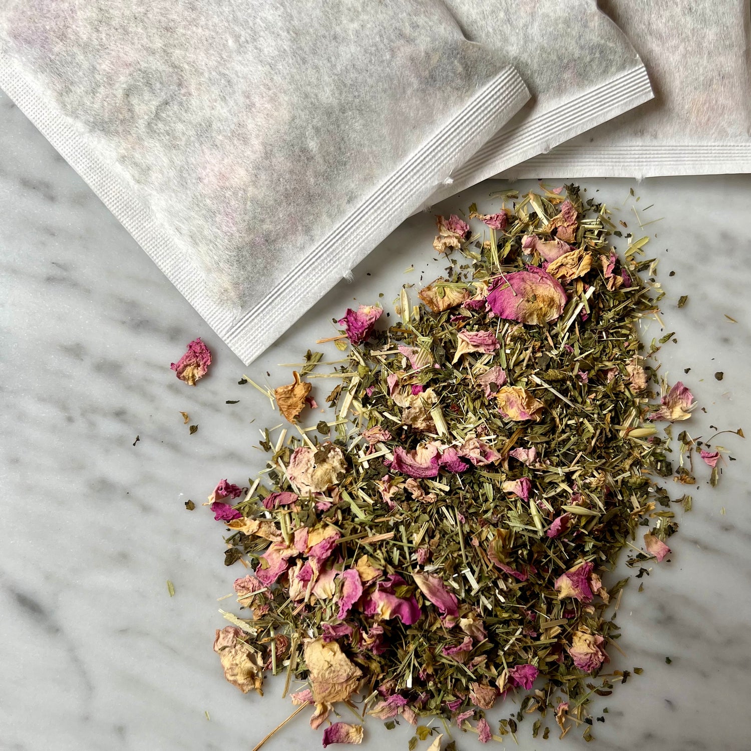 They’re portioned into sachets, so you don’t need any fancy tools. Just place in a jar with boiling water, steep long, squeeze and toss the bag and sip your way to deep nourishment.